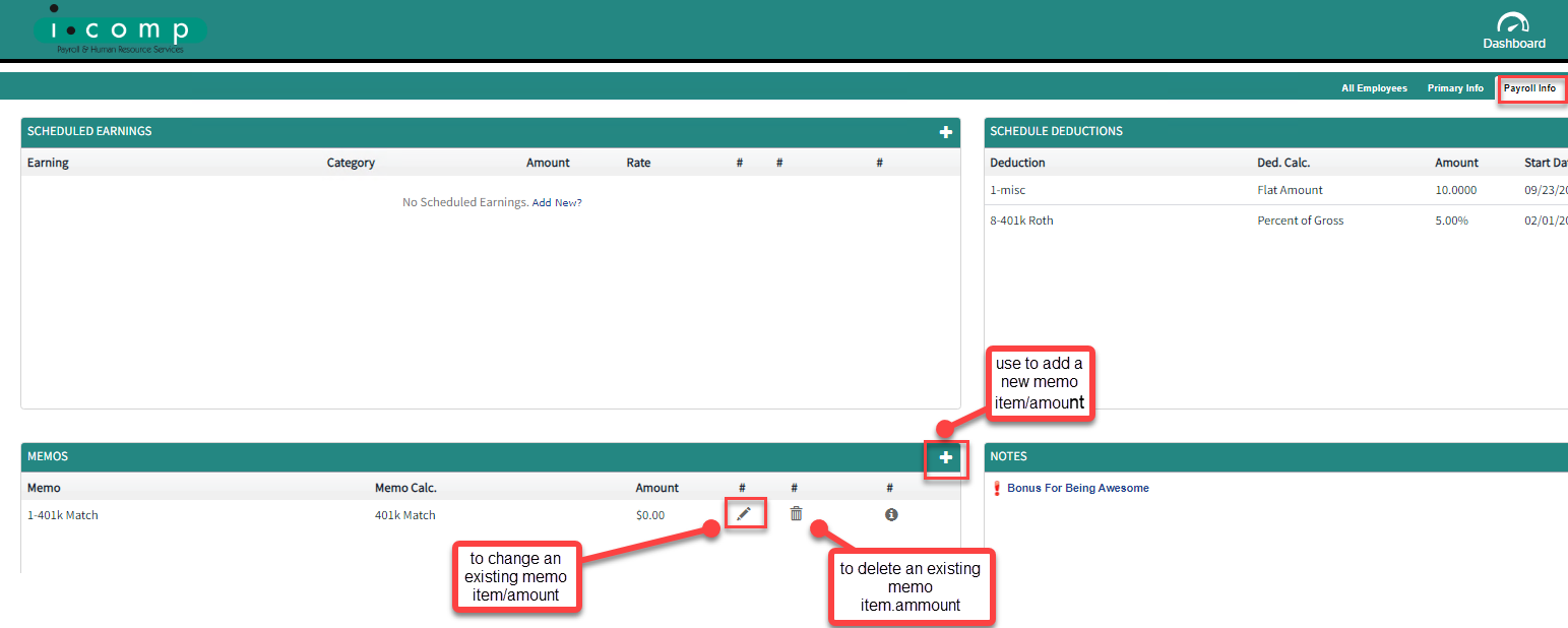 Navigate to the Payroll Info tab (below). You can chose the "+" to add a new memo item, the pencil icon to make a change to an existing memo, or the trash can to delete it.