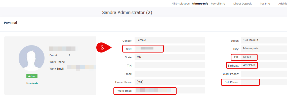 3. On the employee's Primary Info tab, ensure that the following fields are filled in: SSN, Zip, Birthday, Work email and Cell Phone.