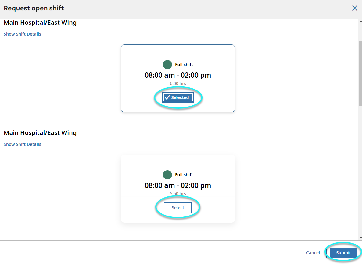 to one or multiple open shifts you’d like to request and select Submit