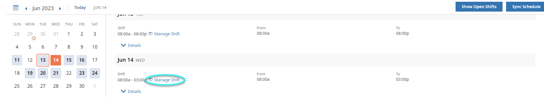 b. Select the Manage Shifts