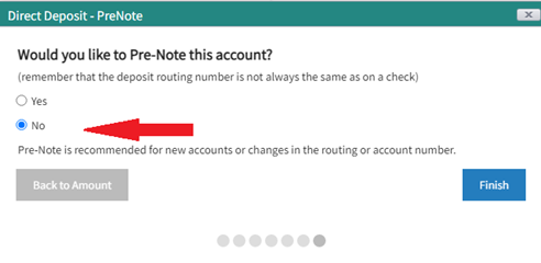 **Note that choosing YES to pre-note will only test the bank account for the upcoming payroll to make sure the account number is accurate, the employee will receive a live check. If account numbers are validated during this payroll, they will receive direct deposit the next payroll**